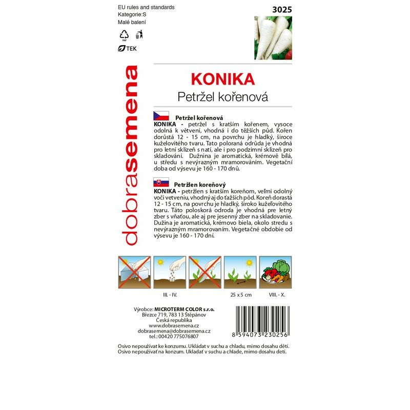 KONIKA - petržel s kratším kořenem, vysoce odolná proti větvení, vhodná i do těžších půd. Kořen dorůstá 12 - 15 cm, na povrchu je hladký, široce kuželovitého tvaru. Tato polopozdní odrůda je vhodná pro letní sklizeň s odnožemi, ale i pro podzimní sklizeň na uskladnění. Dužnina je aromatická, krémově bílá, se slabým mramorováním uprostřed. Vegetační doba od výsevu je 160-170 dní.