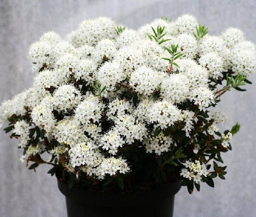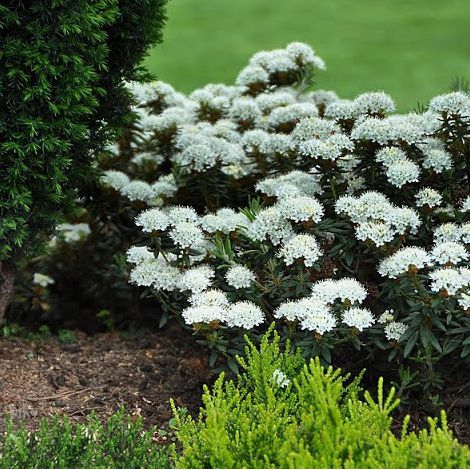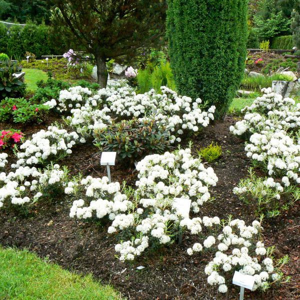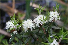 Ledum groenlandicum Helma. Synonymum Rhododendron groenlandicum Helma. Po 10 letech pěstování je rostlina vysoká asi 40 cm. Vyžaduje kyselé, vlhčí půdy, slunce-stín. Je velmi odolný vůči mrazu. Kvete od dubna do května bílými květy.