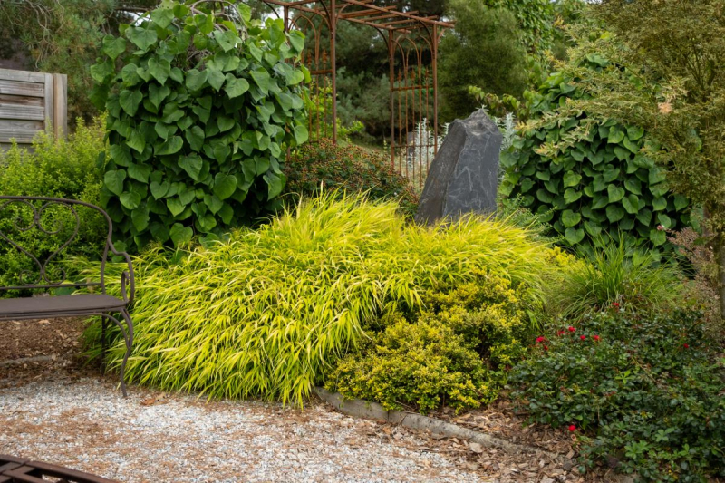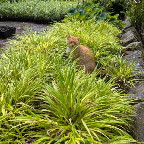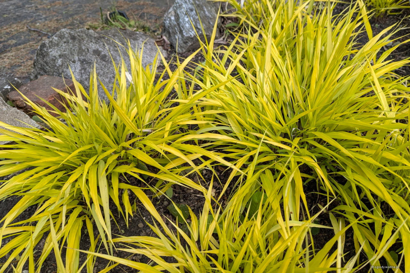 Hakonechloa macra Sunflare je kultivar se žlutými listy, které se na podzim na koncích zbarvují do červena.