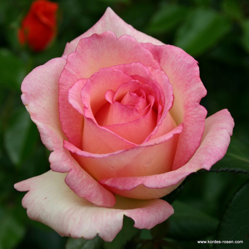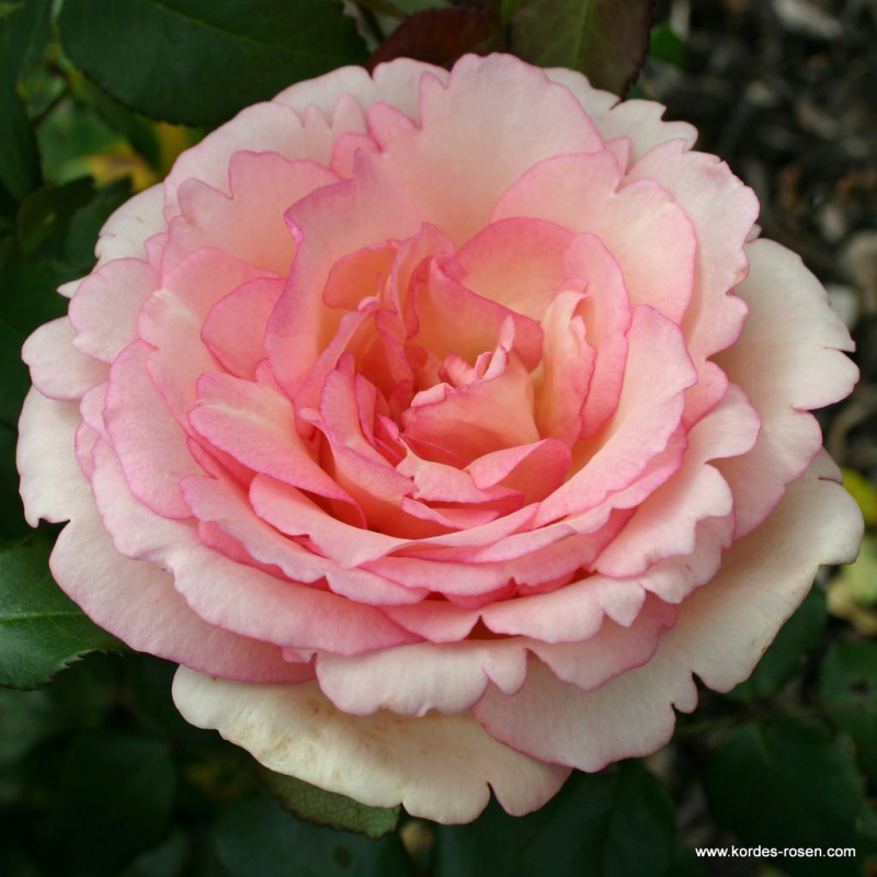 Romantická čajová růže s krajkovými květy v pastelových tónech krémové barvy s růžovým lemem okvětních lístků. Krásná nasládlá vůně.