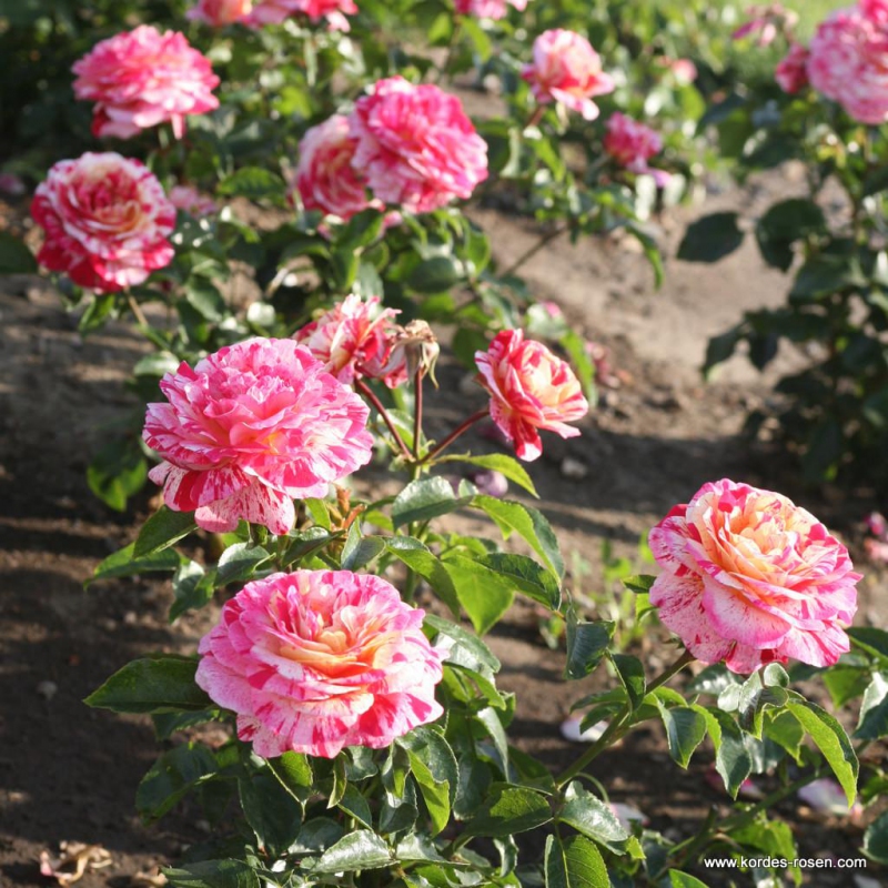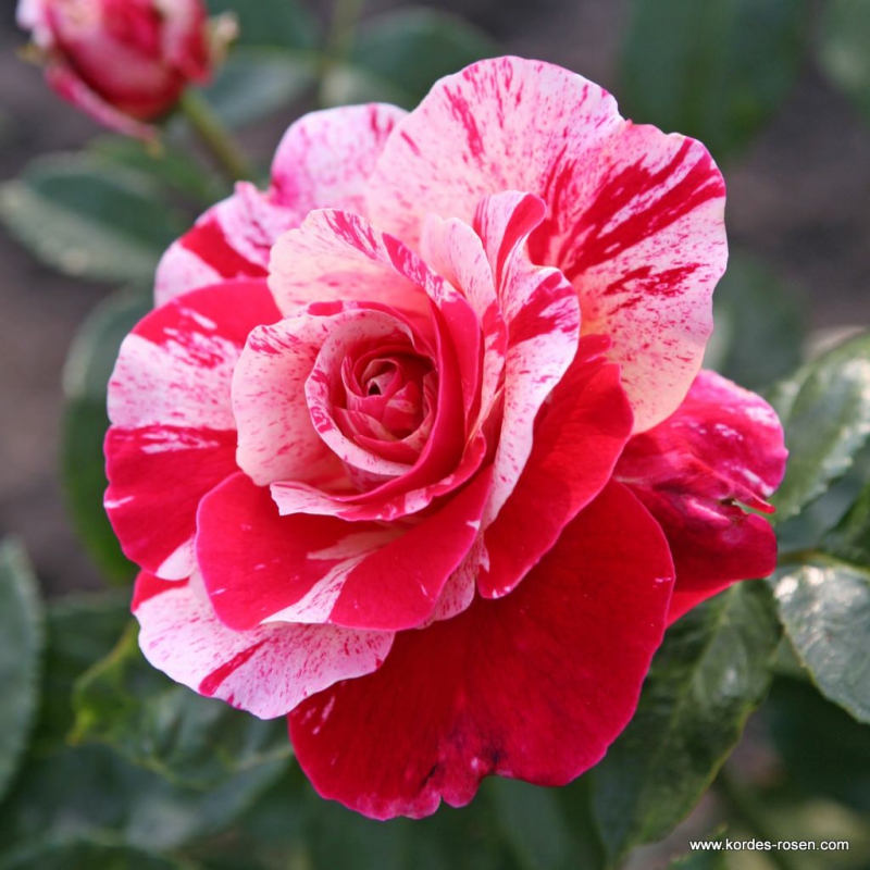 Růže Abracadabra je mnohokvětá růže, má plné květy s nepravidelnou melanží červené a bílé barvy.