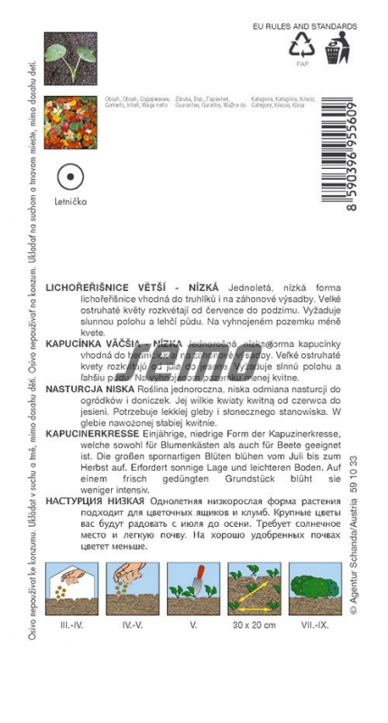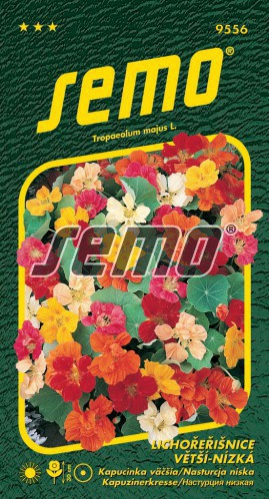 Výrobce: SemoRychle rostoucí jednoletka s kulatými listy ve tvaru štítu. Vytváří ostruhovité, krátce trubkovité květy žlutooranžové až jasně červené barvy. Květy jsou známé také jako neobvyklá, velmi chutná ozdoba pokrmů a salátů. Díky svému baktericidnímu obsahu pomáhají při vnitřních infekcích, zejména močových cest a ledvin, a zvyšují celkovou imunitu organismu. Kapucínka je vhodná pro záhonové výsadby, okenní obruby a dekorativní nádoby. Vyžaduje chudší, propustnou půdu a slunné stanoviště. Nepřehnojujte ji dusíkem, podpořilo by to vegetativní růst na úkor kvetení. Směs barev, kompaktní růst, výška 30 cm.