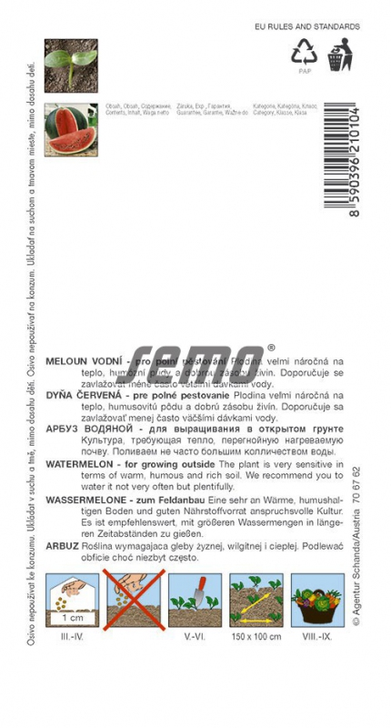 Výrobce: SemoPozdější, vysoce výnosný hybrid odolný vůči chorobám a nepříznivým podmínkám. Plody jsou protáhle kulovité, středně velké, o hmotnosti 4,5 kg. Slupka je tmavě zelená, hladká, pevná. Dužnina je růžová, sladká, jemná a šťavnatá. Ze 100 m² lze sklidit 380-420 kg plodů.