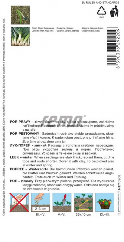 Výrobce: SemoMrazuvzdorný pórek s kratším, ale robustním vzrůstem. Má velmi silný kořenový systém a rychlý růst i při nízkých teplotách. Sklízí se od listopadu do dubna. Nevyžaduje hromadění, nevadne.