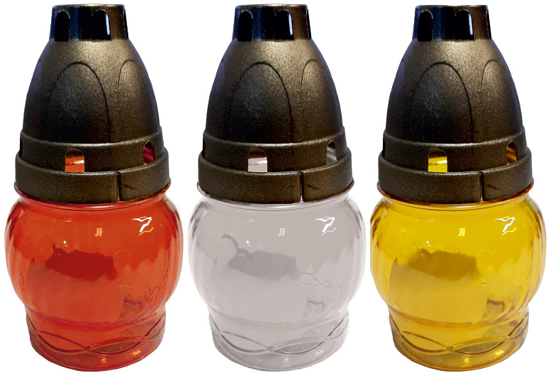 Dekorativní skleněný zapalovač s klasickým designem, dostupný v červené, čiré a žluté. Vrchní část chrání plamen před větrem, takže je vhodný pro použití ve venkovním prostředí - na hřbitovech nebo pietních místech.