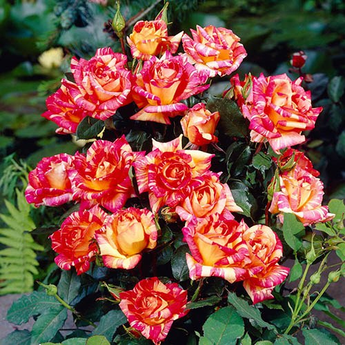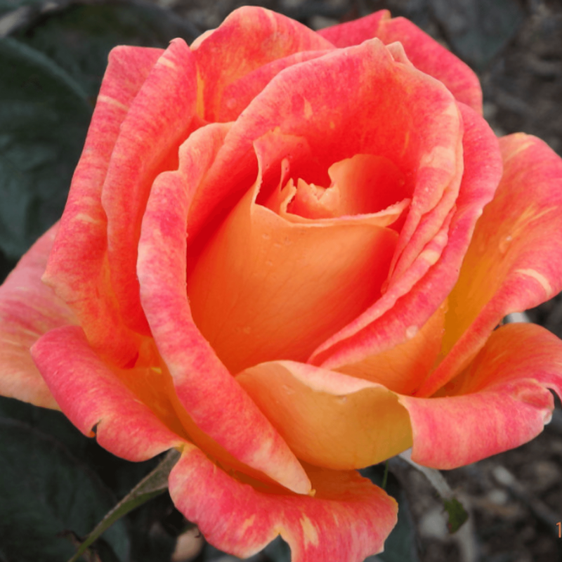 Růže Harry Wheatcroft - krásná plnokvětá růže korálově červené barvy se zlatožlutými znaky.
