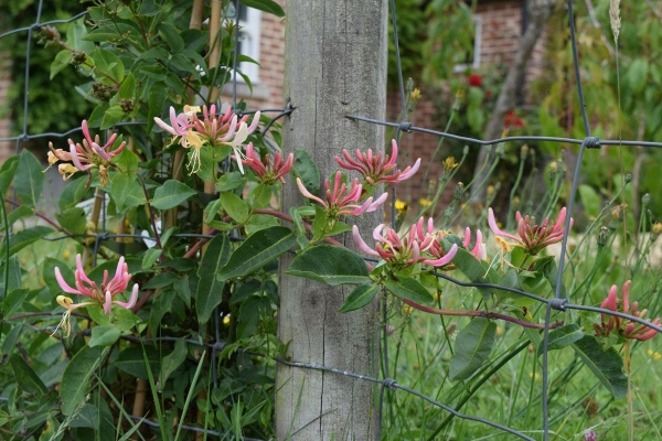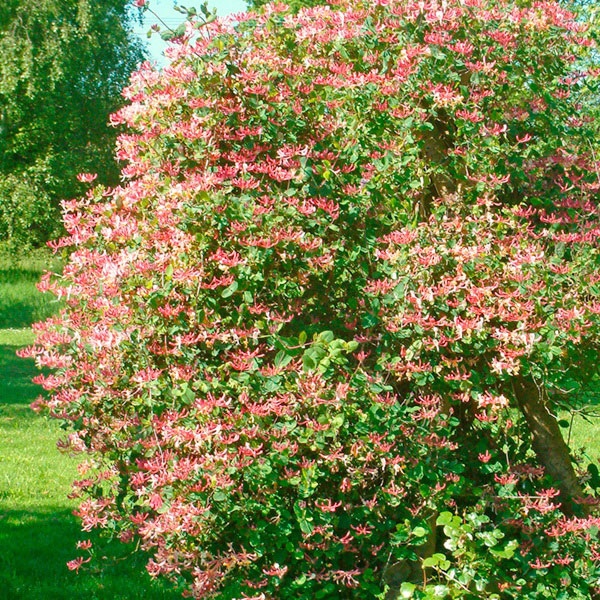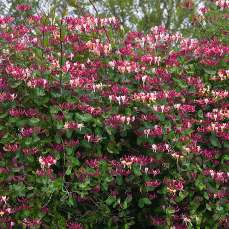 Opadavý, opadavý, liánovitý keř, dorůstající výšky 2-5 metrů. Poměrně husté a pravidelné větvení. Listy téměř kulaté, 4-5 cm velké, tmavě až šedozelené. Květy trubkovité, uvnitř krémově bílé, na vnější straně fialové až vínové. Květy mají výrazně nasládlou vůni, nejvíce večer. Plody karmínově červené, 1-1,4 cm velké. Slouží jako potrava pro ptáky.